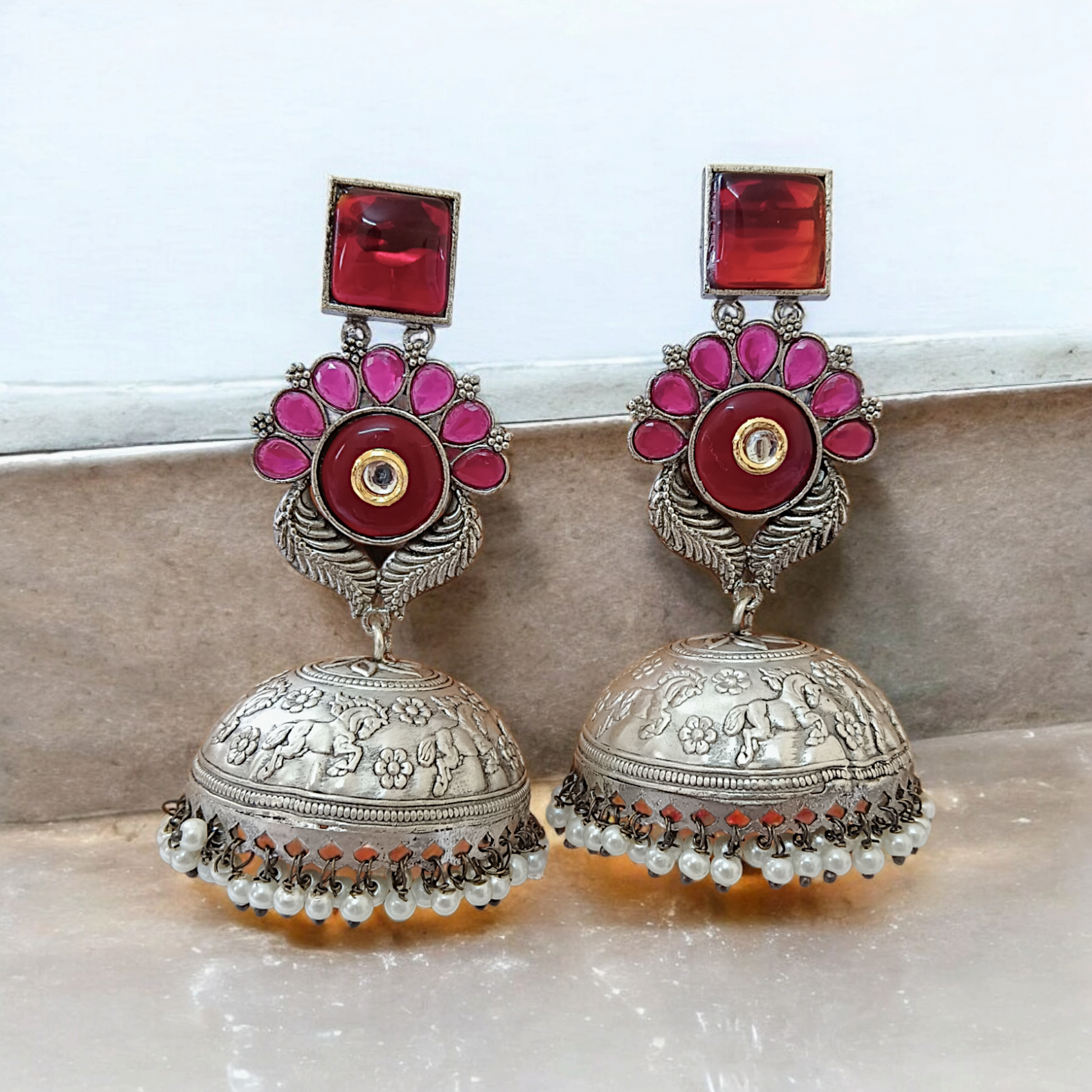 Gulab Silver Jhumka earrings feature an oxidised silver-tone dome richly engraved with elephants and florals, edged with a delicate fringe of white faux pearls. The top showcases a striking combination of a red square stone, circular red centre and surrounding pink petal-like stones over an ornate leaf/peacock-inspired base, creating a vibrant, heritage temple-jewellery feel. Secured with a post-and-push-back closure, these statement jhumkas are perfect for pairing with sarees, lehengas or festive suits when you want a bold, regal ethnic accent.