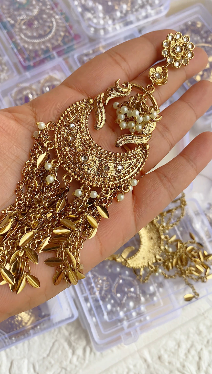 These Leher Celebrity Styled Kundan Drop Long Earrings feature an antique gold-toned alloy base adorned with sparkling Kundan-style stones and delicate faux pearl accents. The design combines a floral stud, intricate crescent chandbali centre and peacock-like detailing, finished with cascading metal tassels for a dramatic, shoulder-grazing look. Secured with a classic post-and-push-back closure, they are perfect as statement bridal or festive earrings, ideal for pairing with lehengas, sarees or indo-western outfits for a rich, regal finish.