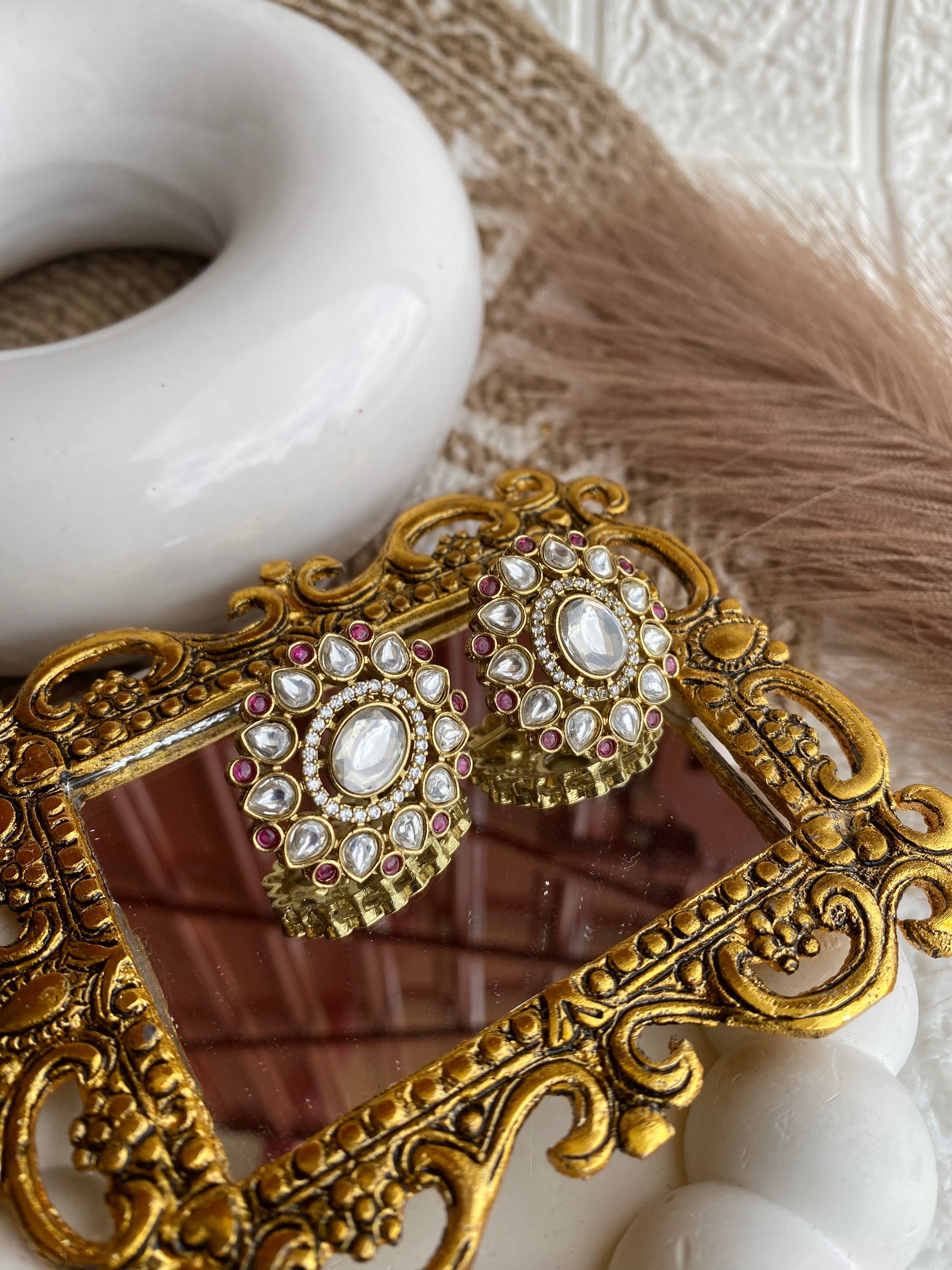 These Moissanite Polki Studs feature a central oval moissanite framed by two radiant halos of tear-drop Polki-style stones, micro pavé crystals and tiny pink accents, all finished in an antique gold-tone metal. The circular floral design gives full lobe coverage while a secure post-and-push-back closure keeps them comfortable and easy to wear for long celebrations. Perfect as a compact yet high-impact statement piece for weddings, festive functions and dressy occasions, they bring a luxurious, regal touch to both traditional and indo-western looks.