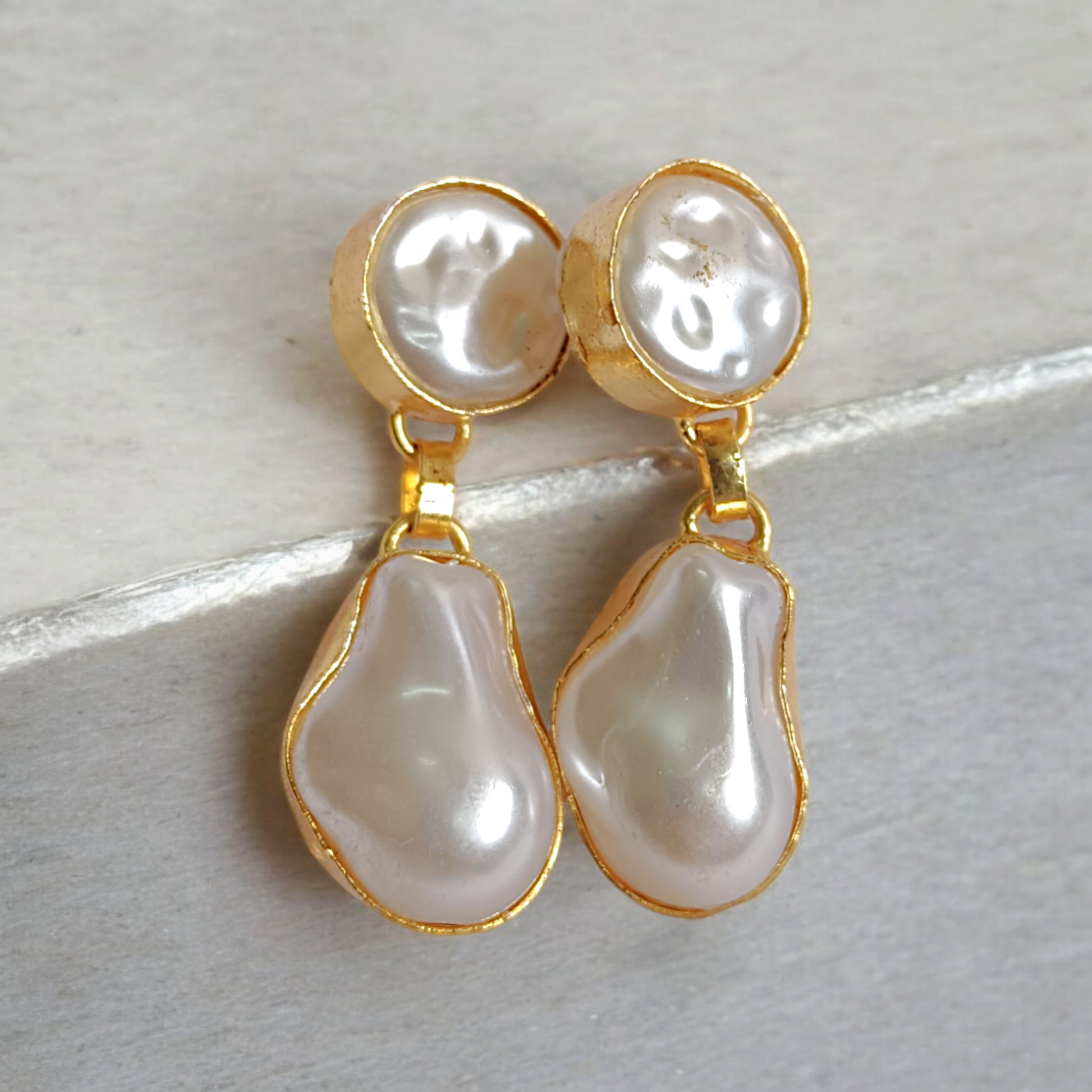These Natural Pearl Anti Tarnish Earrings feature organically shaped baroque pearls framed in a polished gold-tone bezel, creating a refined yet modern look. A round coin pearl sits on the lobe as a stud, while a larger irregular drop pearl is suspended below, giving soft movement and a unique, one-of-a-kind feel. The metal is finished with an anti-tarnish gold plating for longer-lasting shine and easy maintenance. Secured with standard post-and-push-back closures, these earrings are comfortable for day-long wear and pair effortlessly with both casual outfits and semi-formal looks, making them a versatile addition to any jewellery collection.