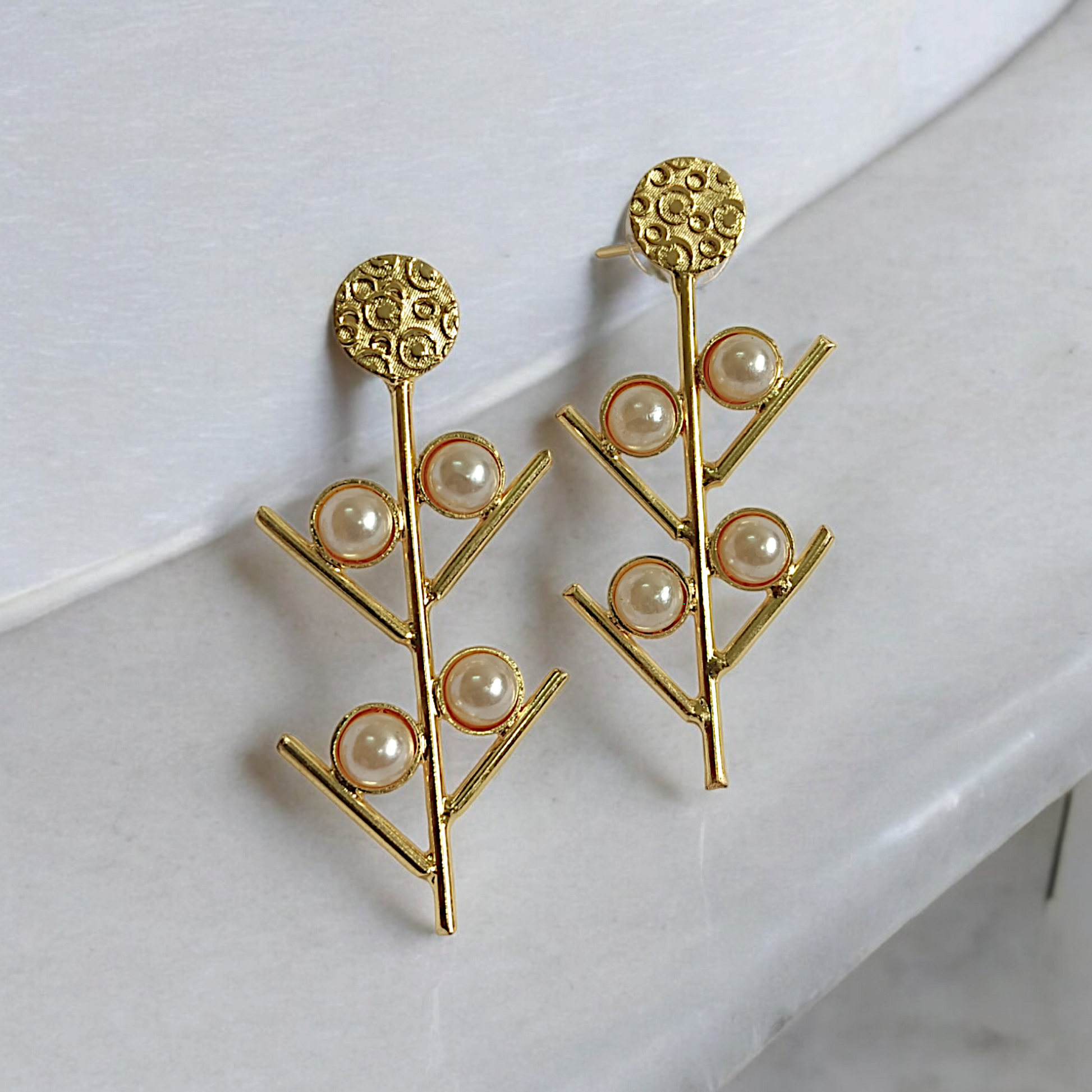 These anti-tarnish pearl drop earrings feature a sleek gold-tone branch motif accented with three bezel-framed faux pearls on each side, creating a clean, nature-inspired silhouette that sits beautifully along the ear. Finished with a protective anti-tarnish coating and secure post-and-push-back closure, they balance everyday comfort with polished elegance—perfect for pairing with both ethnic and contemporary outfits for work, brunches, or festive gatherings.