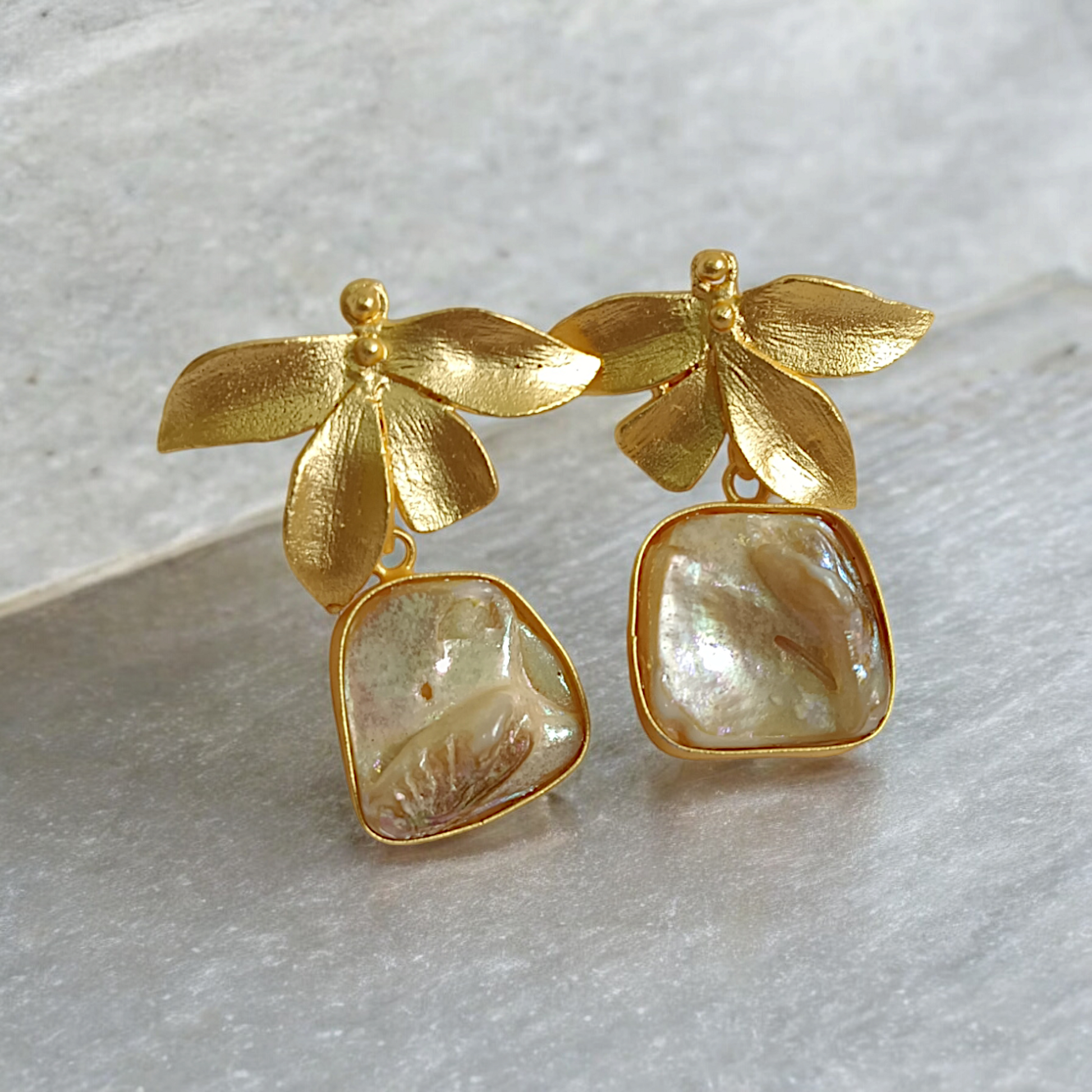 These Butterfly Natural Pearl Anti Tarnish Earrings feature textured gold-tone butterfly tops with softly brushed wings, suspending irregular cushion-cut natural pearl slices framed in a slim bezel. The anti-tarnish gold plating keeps the finish fresh and low-maintenance, while the iridescent baroque pearls add an organic, one-of-a-kind charm. Secured with comfortable post-and-push-back closures, they are ideal as petite statement pieces for festive events, special outings, or elevating everyday and fusion outfits with a refined, nature-inspired look.