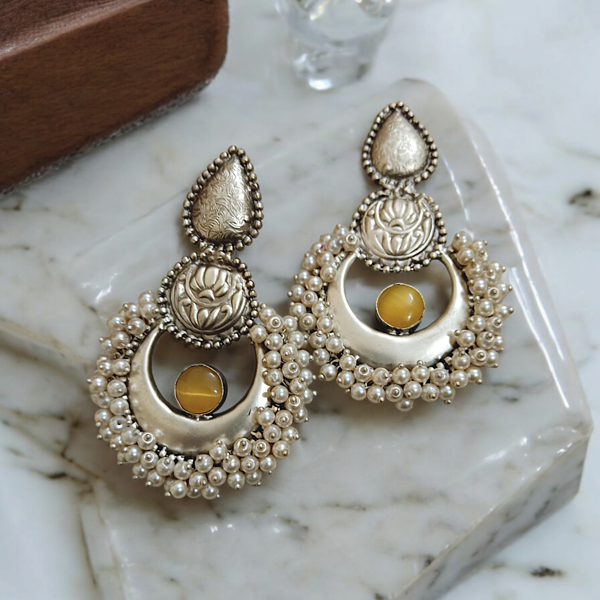 These silver-tone chandbali earrings feature an ornate crescent silhouette edged with dense faux-pearl clusters and a striking mustard-yellow cabochon at the centre, topped with intricately engraved floral and paisley-style motifs. Designed as statement ethnic earrings with a post-and-push-back closure, they offer an antique, handcrafted look ideal for weddings, festive events, and special occasions, beautifully complementing traditional and Indo-fusion outfits alike.