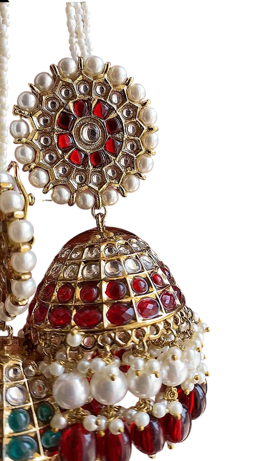 This “Gulshan” oversized jhumka features a richly detailed kundan-style floral stud attached to layered, dome-shaped jhumkas encrusted with glass polki, red and emerald green cabochon-style stones, and lavish rows of faux pearls and beads. Finished in a warm gold tone and anchored with a multi-strand pearl sahara ear chain for added drama and support, it creates a regal, heritage look perfect for weddings and grand festive occasions.