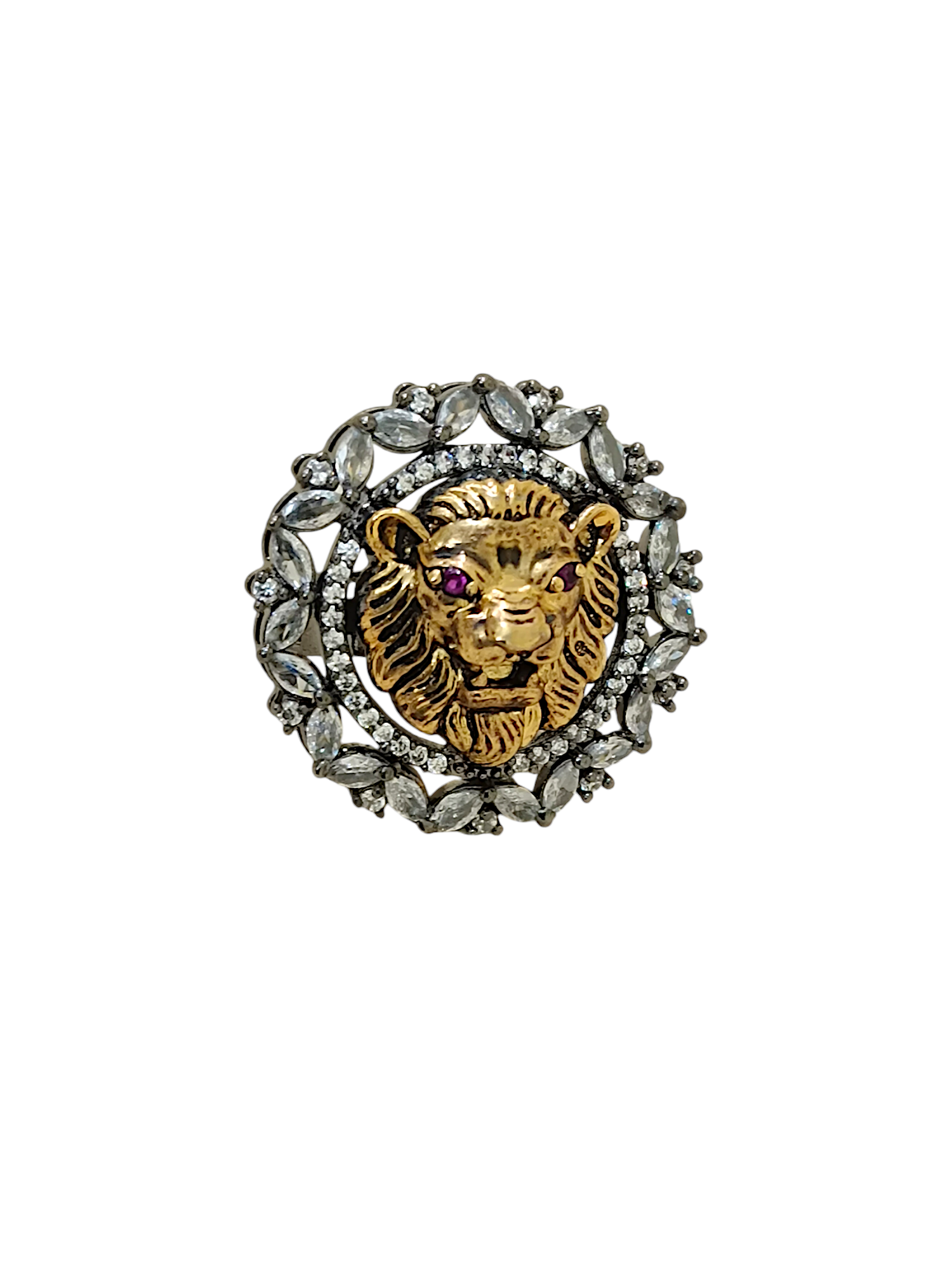 This Statement Tigeress American Diamond Adjustable Ring features a striking gold-tone tigeress head with vivid red crystal eyes, framed by a sparkling halo of marquise and round-cut American diamonds in a silver-tone setting. The dual-tone finish and detailed animal motif create a bold, luxe look that instantly elevates party, festive, and evening outfits. Designed with an adjustable band, it offers a comfortable medium fit across multiple finger sizes, making it an eye-catching and versatile statement piece.