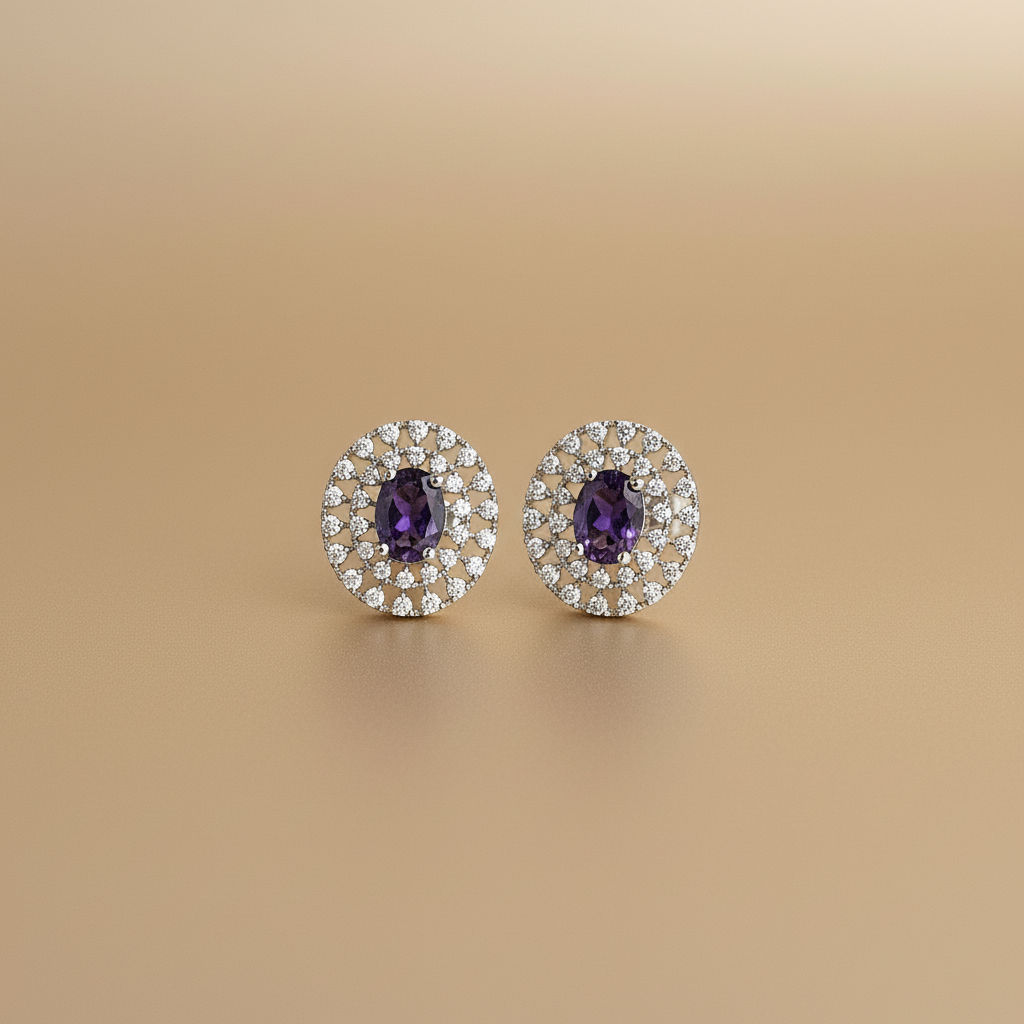 These Violet Zirconia CZ Stud Earrings feature an oval violet center stone framed by two sparkling halos of clear cubic zirconia, all set in a sleek silver-tone rhodium-style finish. The prong-set stones create high brilliance and a luxe, gem-like look while the post-and-push-back closure ensures a secure, comfortable fit on the earlobe. Perfect as statement studs for parties, receptions, and festive occasions, they add an elegant pop of color that pairs beautifully with both Western and ethnic outfits.